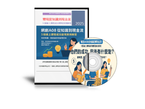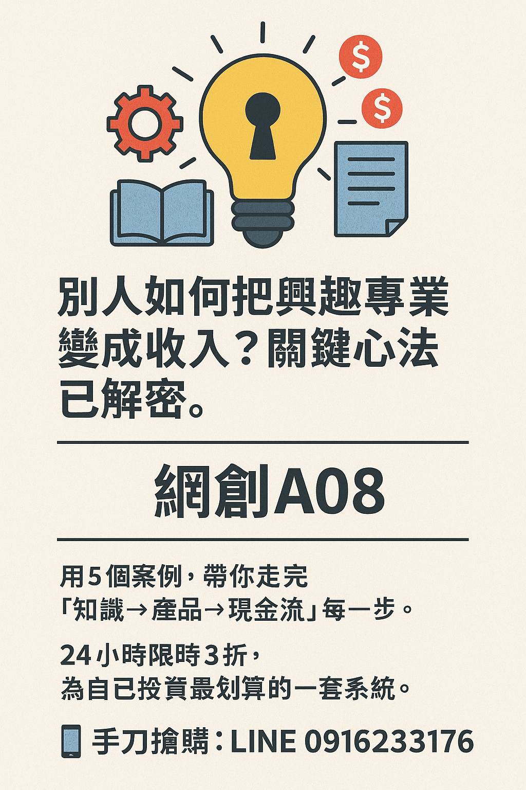 《網創A08:從知識到現金流》就是這項高報酬的投資。我們將價值數萬元的顧問級策略,凝聚成這套「影音課程 + 完整電子書」的強效組合。你獲得的不是靈感,而是五份來自真實戰場的「變現藍圖」,以及能讓你少走三年彎路的實戰工具包(包括課程大綱模板、驗證清單、文案範本)。